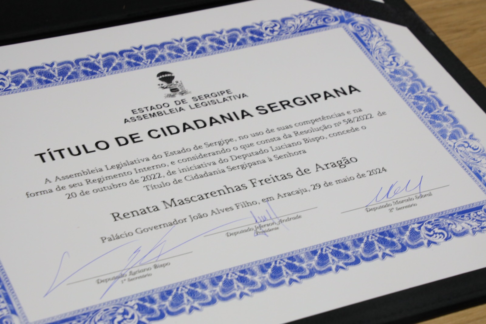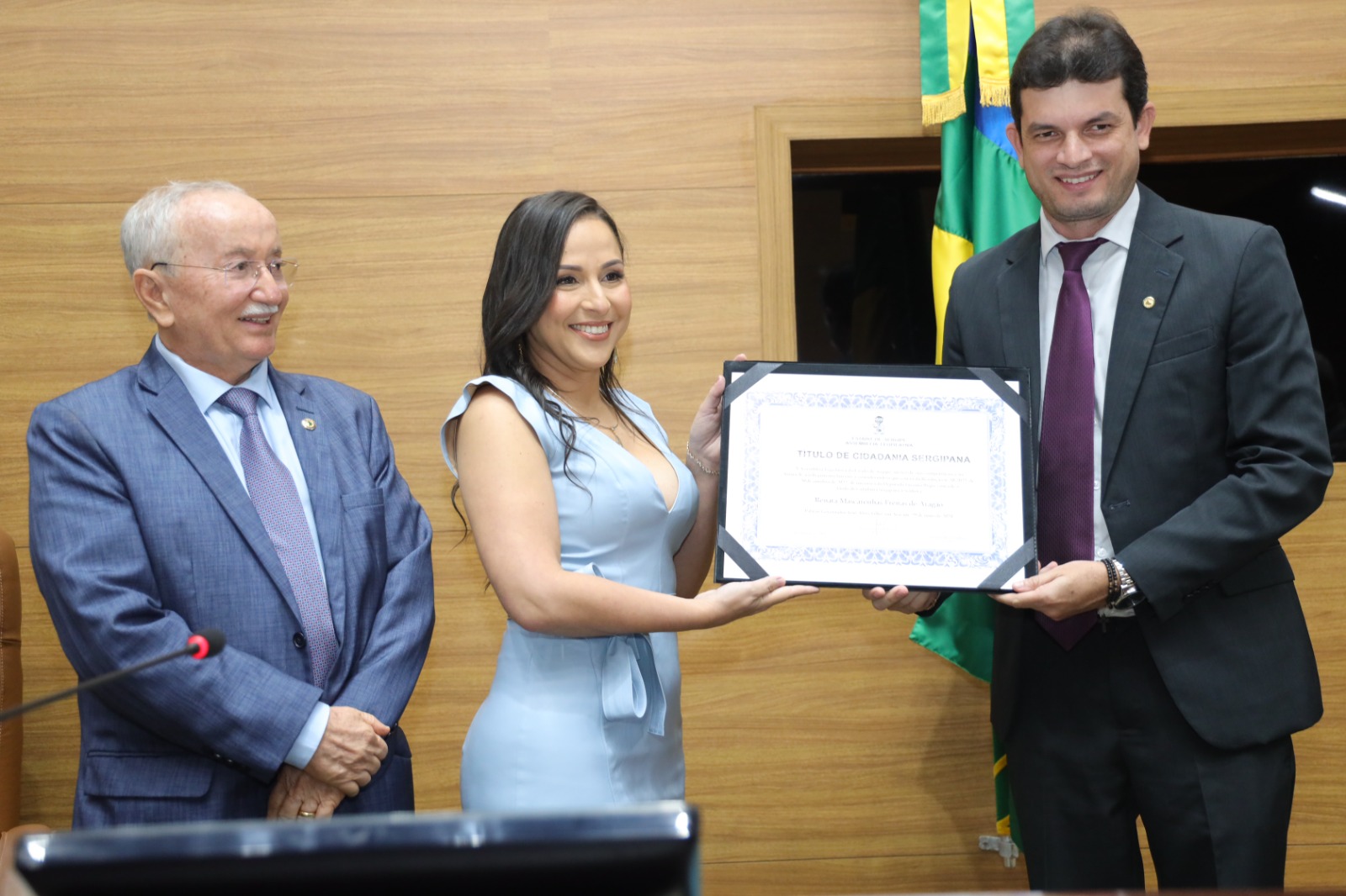 O deputado Luciano Bispo (PSD), entregou na tarde desta quarta-feira (29) no plenário da Assembleia Legislativa do Estado de Sergipe (Alese), o Título de Cidadania à advogada Renata Mascarenhas Freitas de Aragão, assessora da Coordenadoria da Infância e da Juventude do Tribunal de Justiça (TJSE).