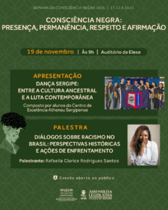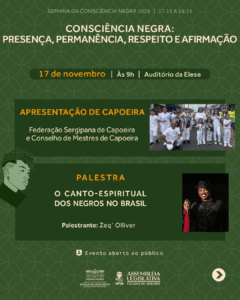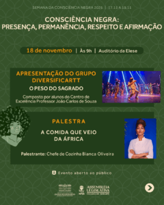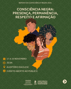 De 17 a 19 de novembro, o auditório da Escola do Legislativo (Elese) recebe uma programação especial em alusão à Semana da Consciência Negra, com o tema “Presença, Permanência, Respeito e Afirmação”. O objetivo é promover reflexão, diálogo e valorização da história, da luta e das contribuições do povo negro para a construção do Brasil.