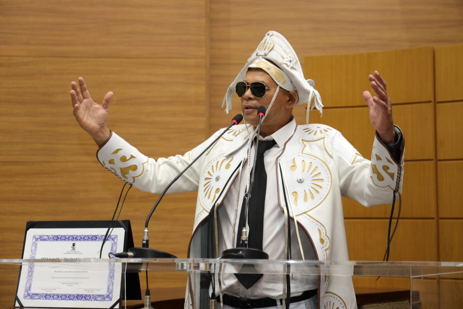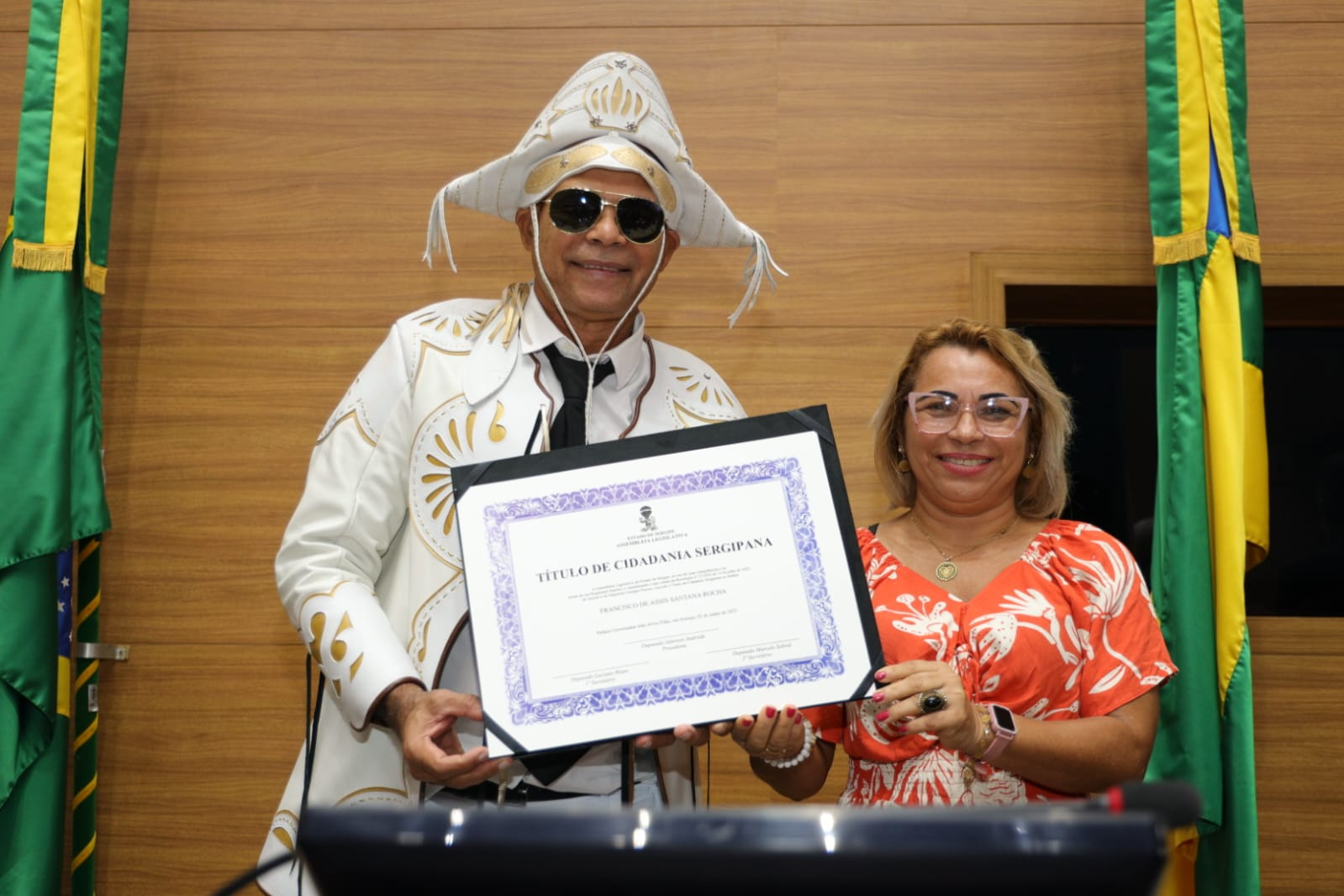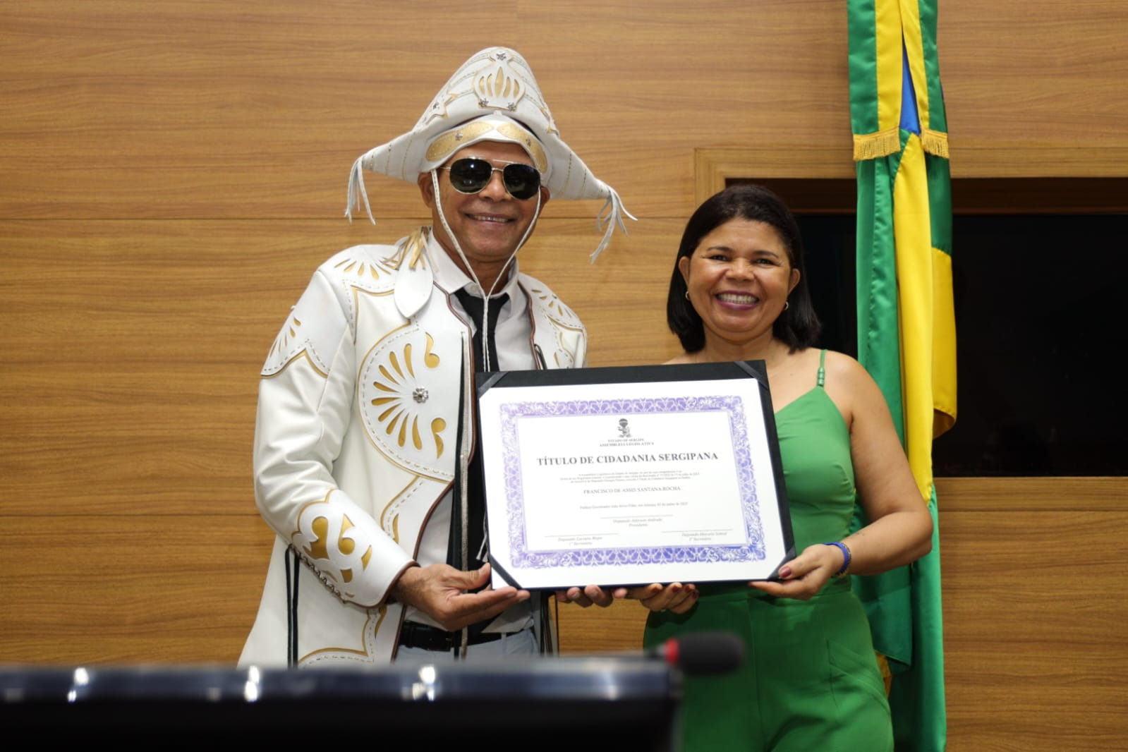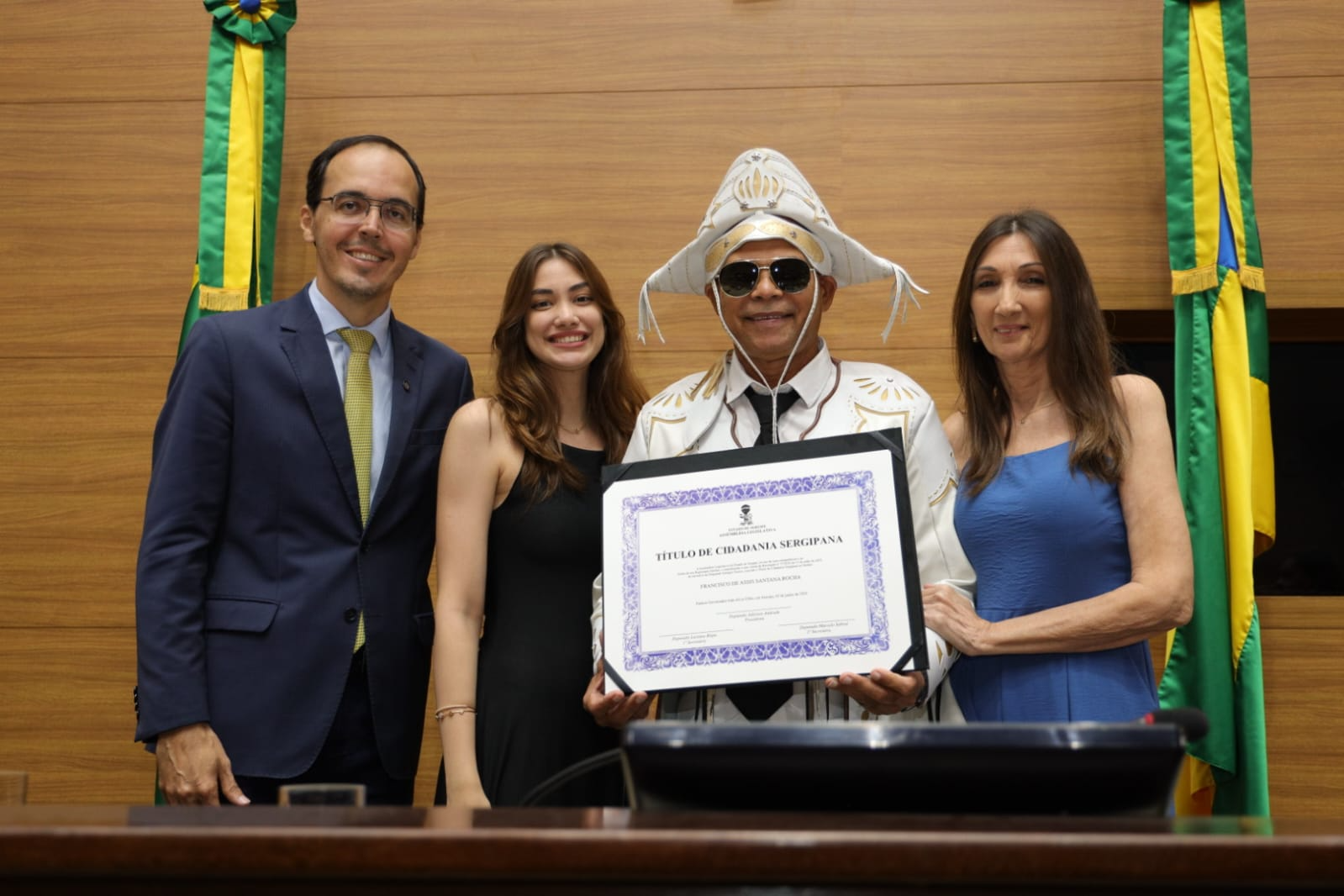 Com a voz embargada, Santana revelou que seu amor por Sergipe se transformou em sonho e, agora, em realidade: “Sergipe me acolheu como filho, e hoje me sinto parte desta terra. Essa homenagem é um sonho realizado. Sinto-me profundamente lisonjeado por receber esse título tão significativo. A gente não escolhe o lugar onde nasce, mas tem o privilégio de escolher onde deseja viver. Cheguei a Aracaju em 2001, transferido pela Força Aérea Brasileira, e logo me encantei com essa cidade acolhedora, com essa terra fértil para o forró, ritmo que sempre esteve presente na minha vida, herdado do meu pai, que era fã e intérprete de Luiz Gonzaga. Me apaixonei por Sergipe de tal forma que pensei: ‘Um dia, ainda vou ser sergipano’. E esse dia chegou. Hoje, 2 de junho de 2025, recebo essa honraria na Assembleia Legislativa com o coração cheio de gratidão. Tenho orgulho em dizer que agora sou sergipano de direito. Estou no lugar certo, entre um povo generoso, que sabe receber e valorizar quem escolhe esta terra para viver. Fazer parte da história de Sergipe é uma alegria imensa”, declarou.
