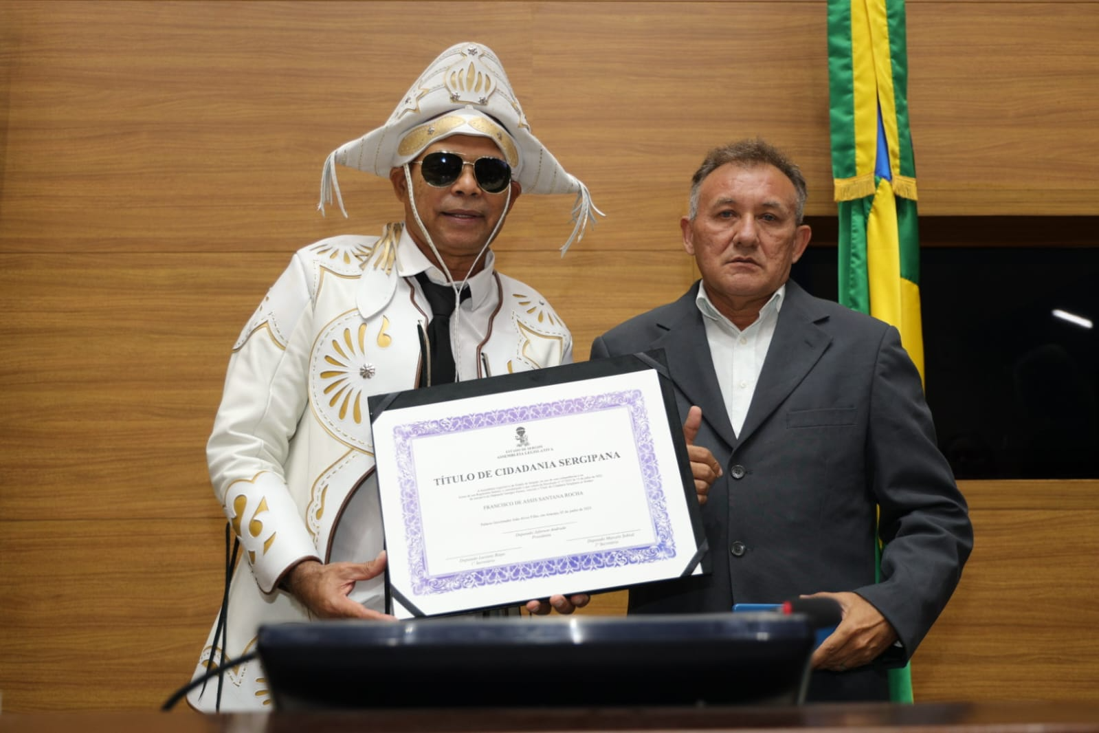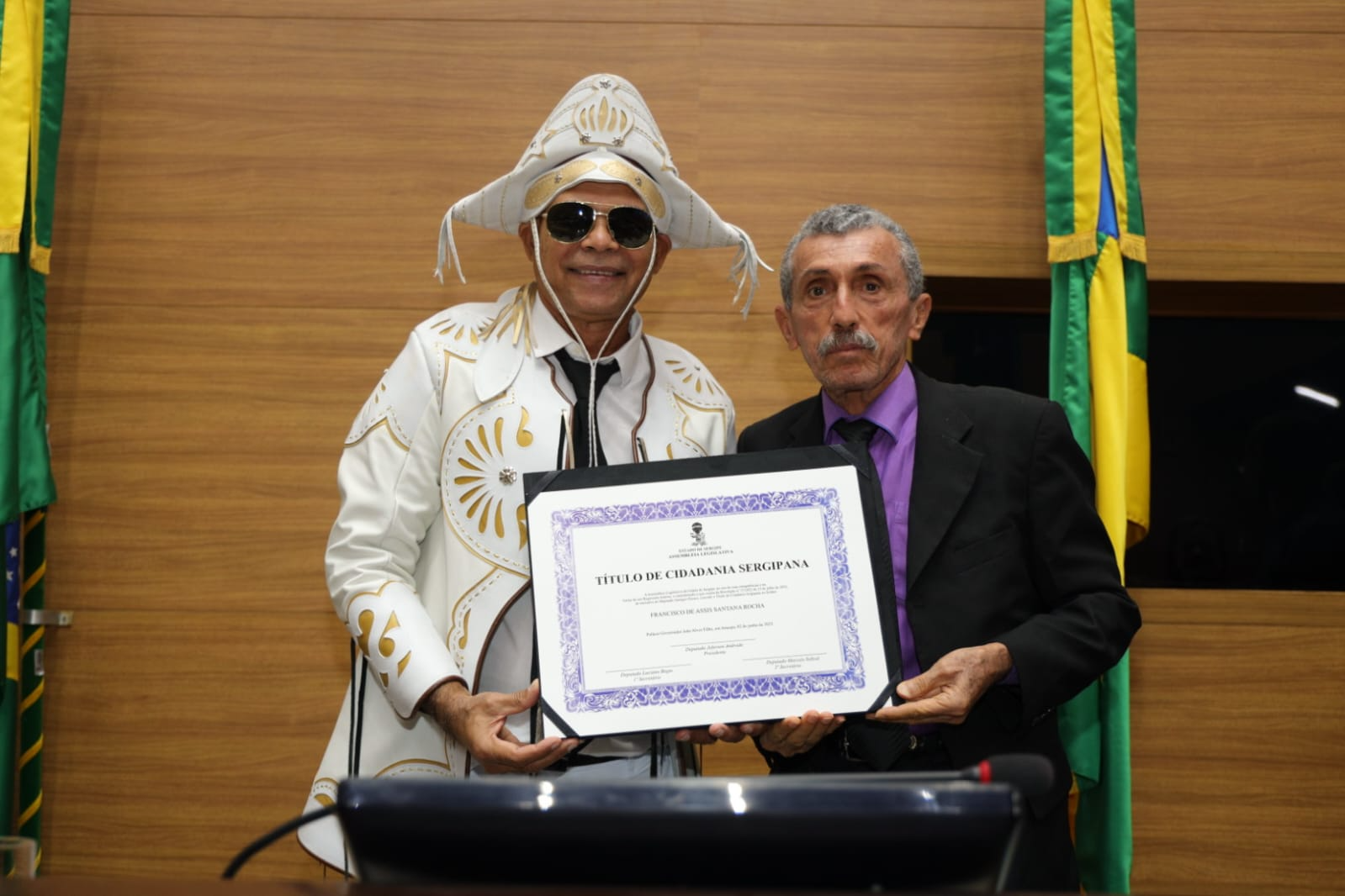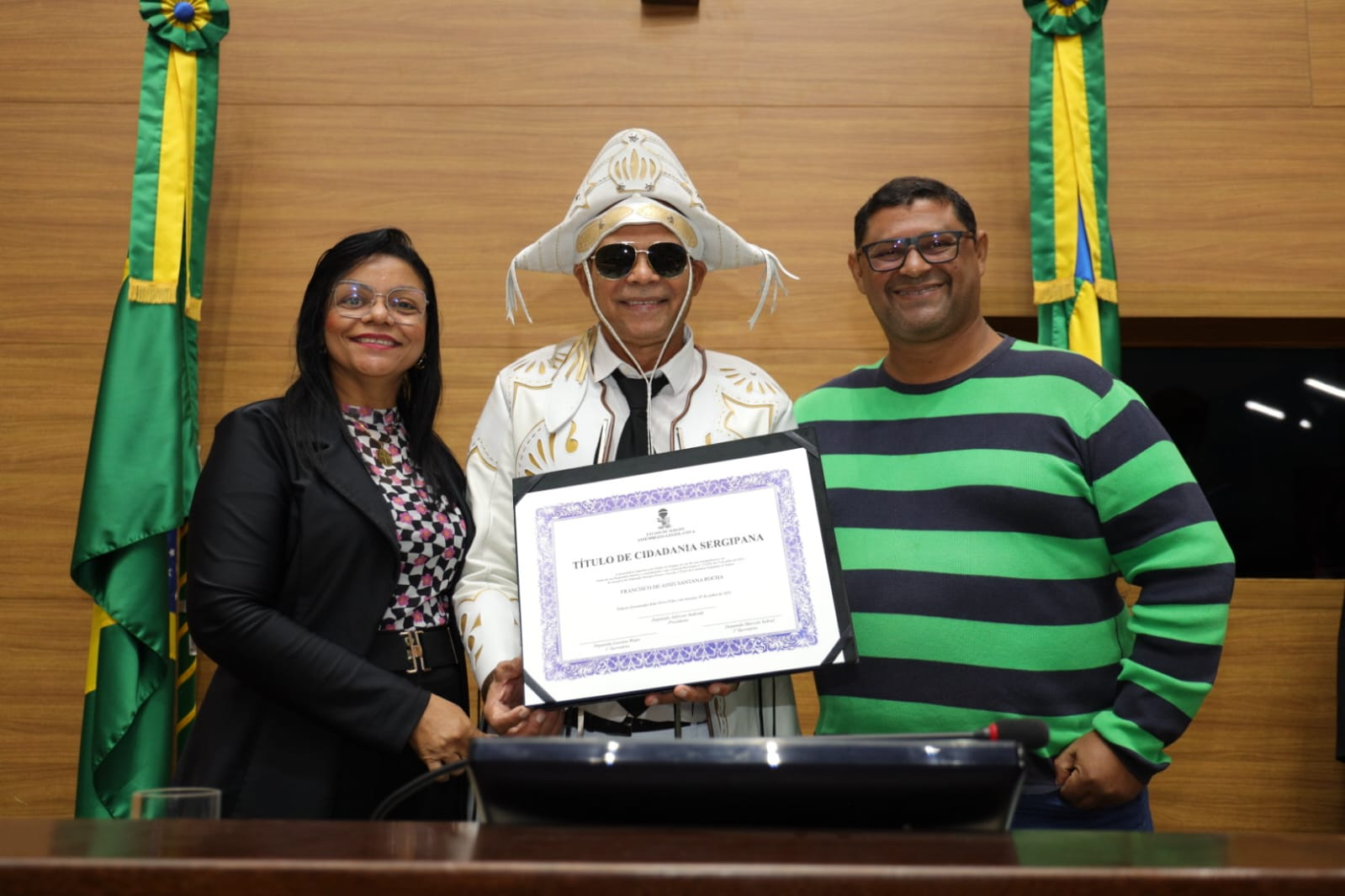 Nesta segunda-feira (2), o Plenário da Assembleia Legislativa de Sergipe (Alese) foi palco de uma Sessão Especial para a entrega do Título de Cidadania Sergipana ao cantor, músico e compositor alagoano Francisco de Assis Rocha, mais conhecido como “Santana Baião da Penha”. A homenagem, de autoria do deputado Georgeo Passos (Cidadania), reconhece a trajetória do artista na valorização da cultura nordestina e seu vínculo afetivo com Sergipe.
