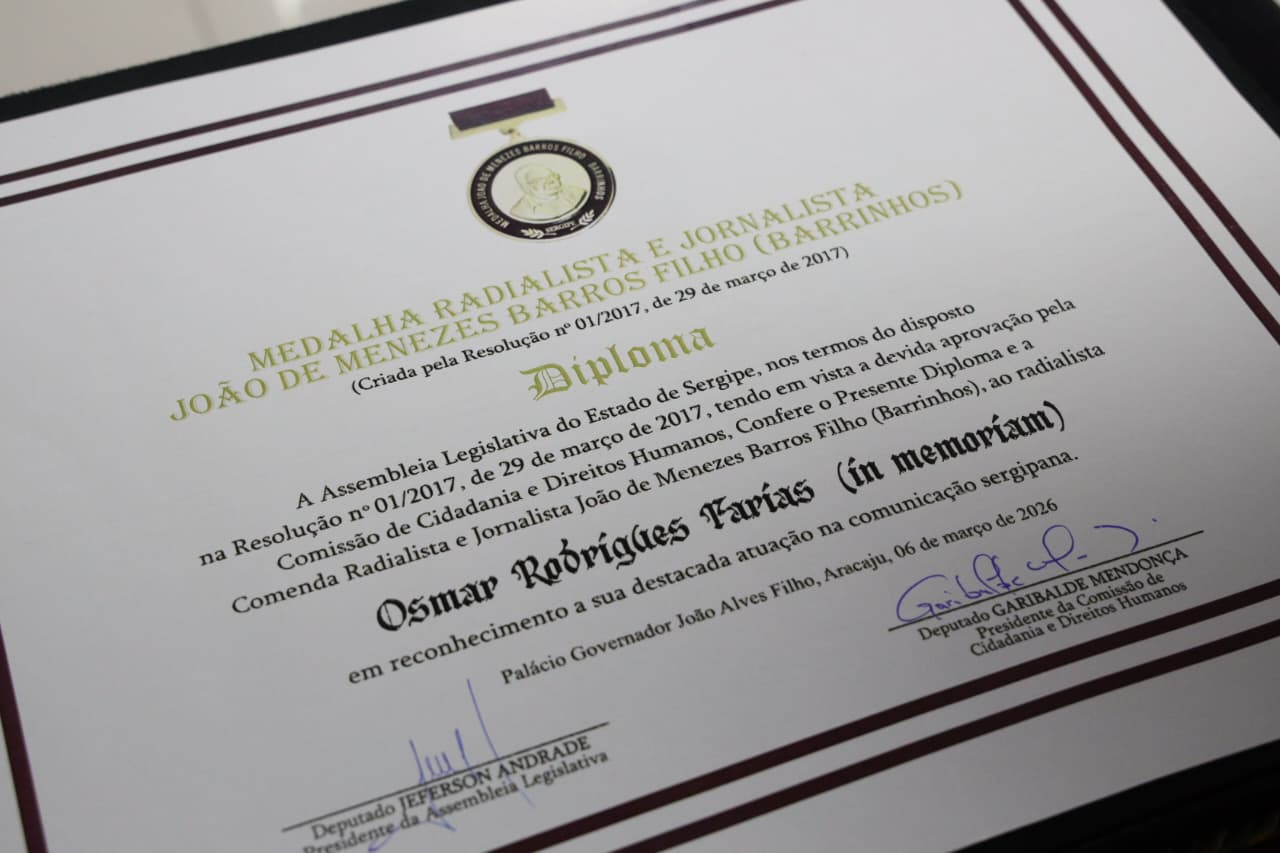 A entrega da Medalha Radialista e Jornalista João de Menezes Barros Filho (Barrinhos) simboliza o reconhecimento da Assembleia Legislativa de Sergipe à trajetória de vida e ao trabalho desenvolvido por Osmar Farias em favor da comunicação e do povo do sertão.