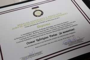 A Assembleia Legislativa de Sergipe (Alese) realizou, na manhã desta sexta-feira (6), no gabinete da Presidência, a solenidade de entrega póstuma da Medalha Radialista e Jornalista João de Menezes Barros Filho (Barrinhos) ao radialista e ex-prefeito de Monte Alegre, Osmar Rodrigues Farias (in memoriam). A homenagem foi proposta pelo deputado Chico do Correio (PT) e recebida por familiares do comunicador.