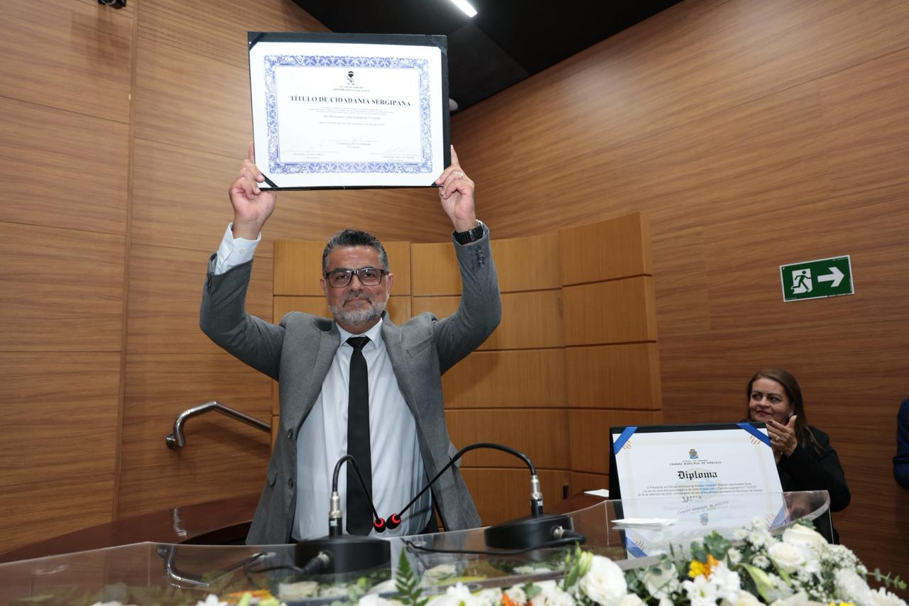 “Primeiro, eu estou me sentindo muito feliz, honrado. Era um desejo muito antigo, porque eu amo demais o estado de Sergipe. Eu quase nasci em Sergipe. A minha cidade original é Cícero Dantas, quase fronteiriça, e toda a nossa vida sempre esteve ligada a Sergipe. O turismo, as praias, a faculdade, o shopping, os hospitais, tudo sempre foi aqui. Inclusive, o sotaque da minha cidade é muito mais parecido com o sergipano do que com o de Salvador. Então, estou muito feliz, me sinto honrado e agradeço à Assembleia Legislativa, a todos os deputados e, em especial, ao deputado Georgeo Passos. Ele conhece a minha jornada pública, as ações sociais, o nosso posicionamento em defesa da cidadania e dos valores de fé. Hoje, por poucos quilômetros, eu não nasci em Sergipe, mas agora sou considerado cidadão sergipano. Estou realizado.”