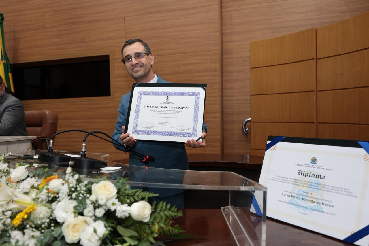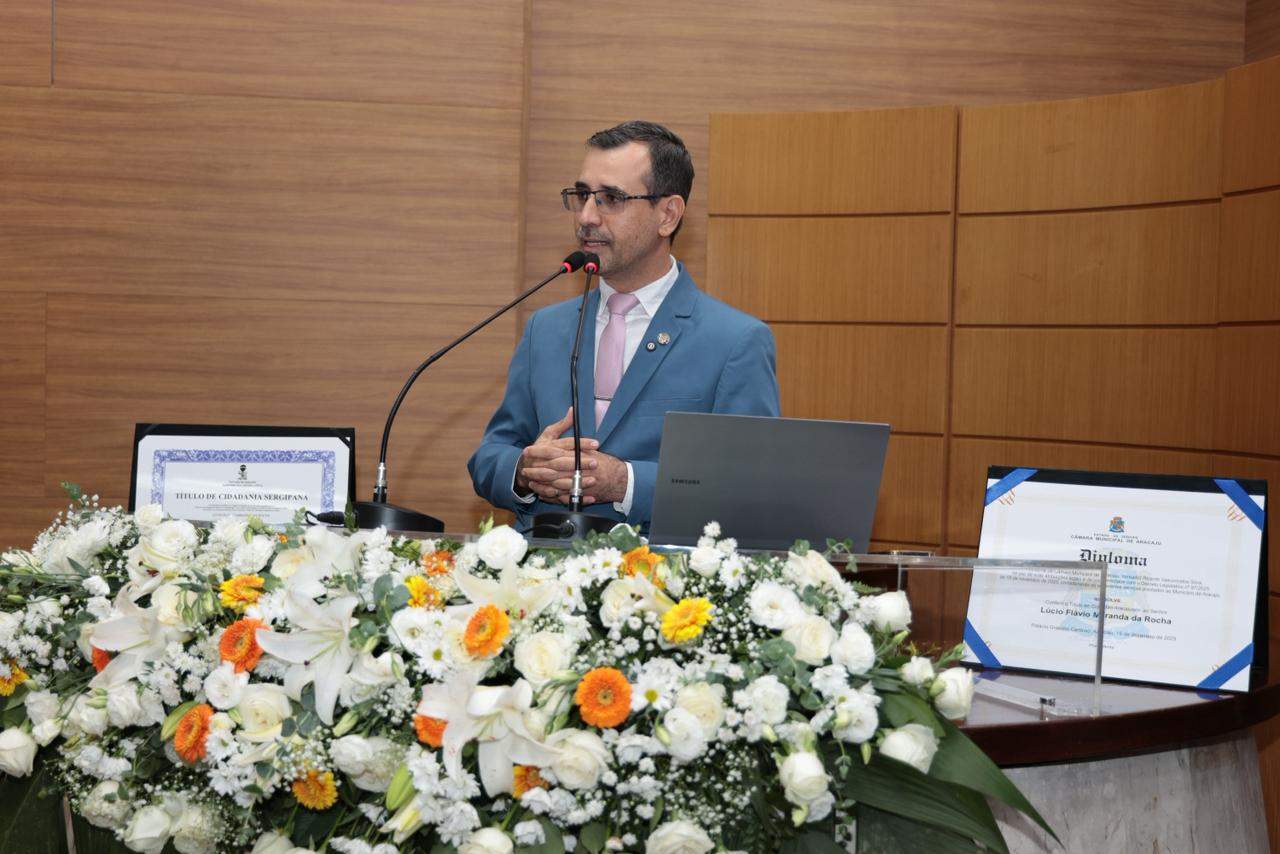 “Hoje é uma tarde muito especial, marcada pela convergência entre a Câmara Municipal de Aracaju e a Assembleia Legislativa de Sergipe, em que cada Casa cumpre o seu papel institucional de reconhecer e valorizar cidadãos que dedicaram sua vida ao serviço público e ao desenvolvimento de nossa sociedade. De forma unânime, tanto os vereadores quanto os deputados estaduais reconheceram a trajetória de Lúcio Flávio, consolidando-o como cidadão aracajuano e sergipano. Esse gesto simboliza não apenas uma homenagem individual, mas a valorização de uma história construída com trabalho árduo, compromisso, ética e dedicação à nossa cidade e ao nosso Estado. É uma alegria imensa poder celebrar este momento ao lado de alguém com quem compartilho valores, princípios e uma caminhada sólida na vida pública. Momentos como este nos lembram da importância de reconhecer aqueles que contribuem de forma significativa para o fortalecimento das instituições, para o desenvolvimento da comunidade e para a construção de uma sociedade mais justa e participativa.”