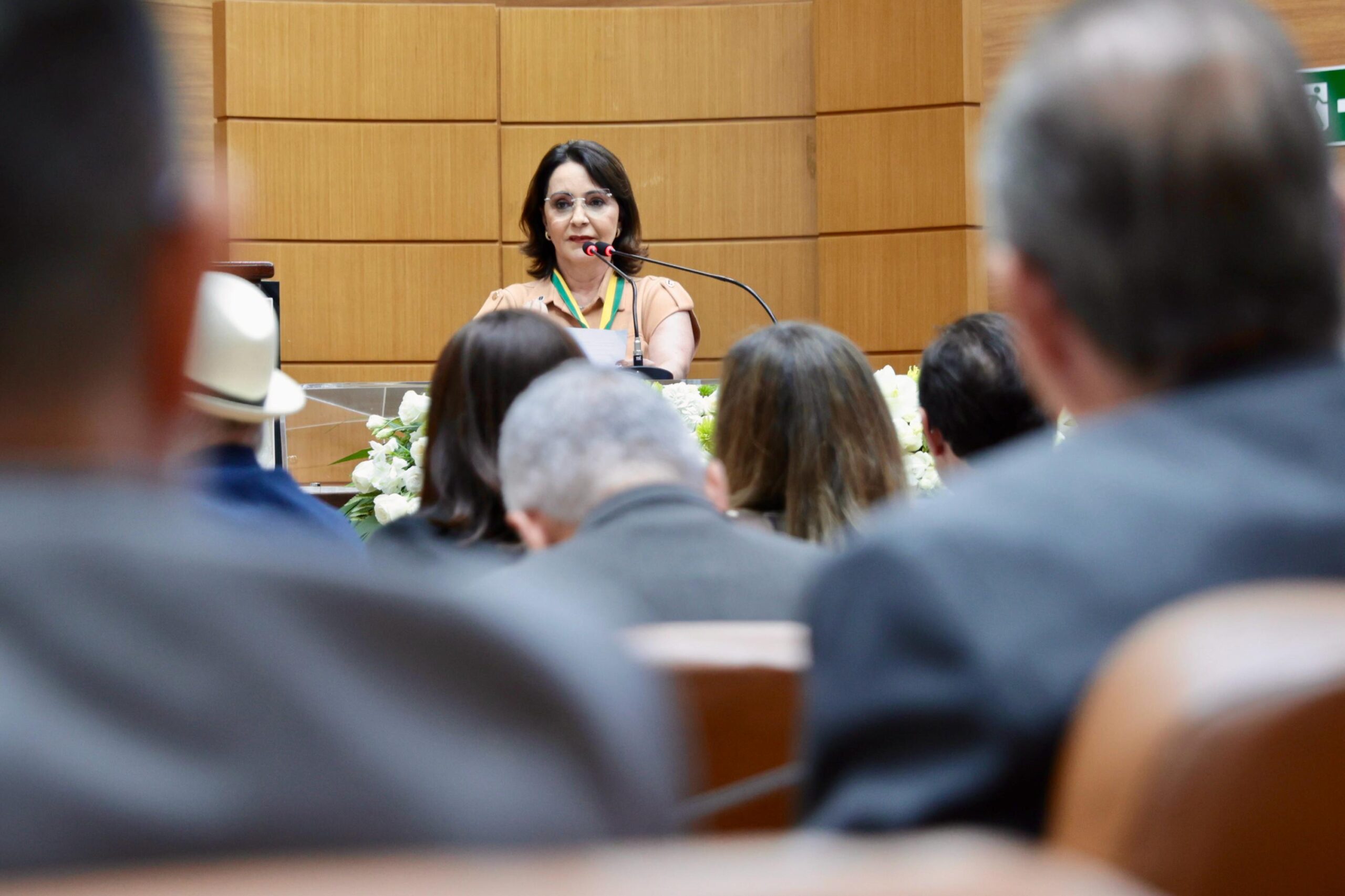 Após receber a medalha, a prefeita Emília Corrêa emocionou o público ao falar sobre o significado da homenagem e sobre o sentimento de responsabilidade que carrega consigo.