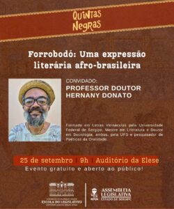Formado em Letras Vernáculas pela Universidade Federal de Sergipe (UFS), com mestrado em Literatura e doutorado em Sociologia, também pela UFS, o professor Hernany trará reflexões sobre as expressões culturais e literárias negras no Brasil, destacando o papel do “forrobodó” enquanto linguagem e identidade afro-brasileira.