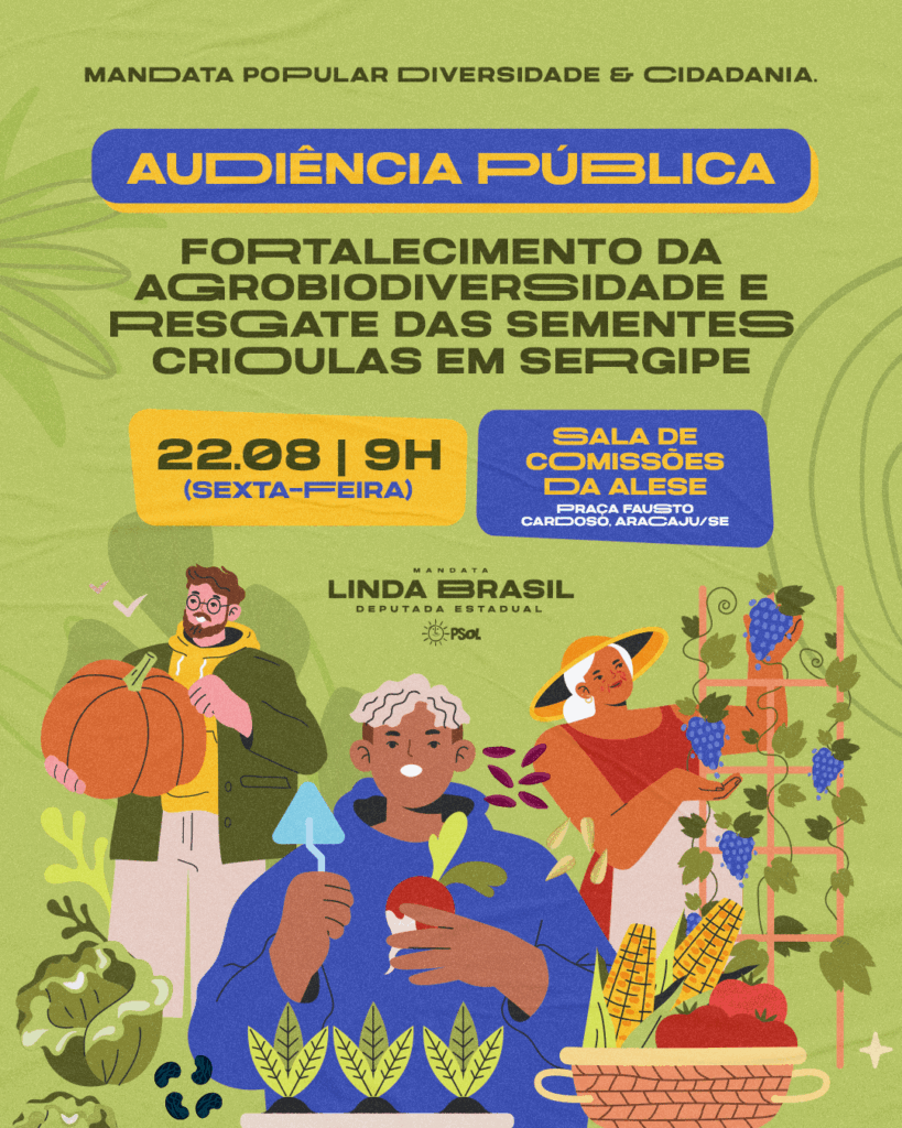 Nesta sexta-feira (22), a partir das 9h, a Assembleia Legislativa de Sergipe sediará a Audiência Pública “Fortalecimento da Agrobiodiversidade e Resgate das Sementes Crioulas em Sergipe”. A programação será desenvolvida através da Comissão de Agricultura e Meio Ambiente, por requerimento da deputada Linda Brasil (Psol), juntamente com o Movimento Camponês Popular (MCP).