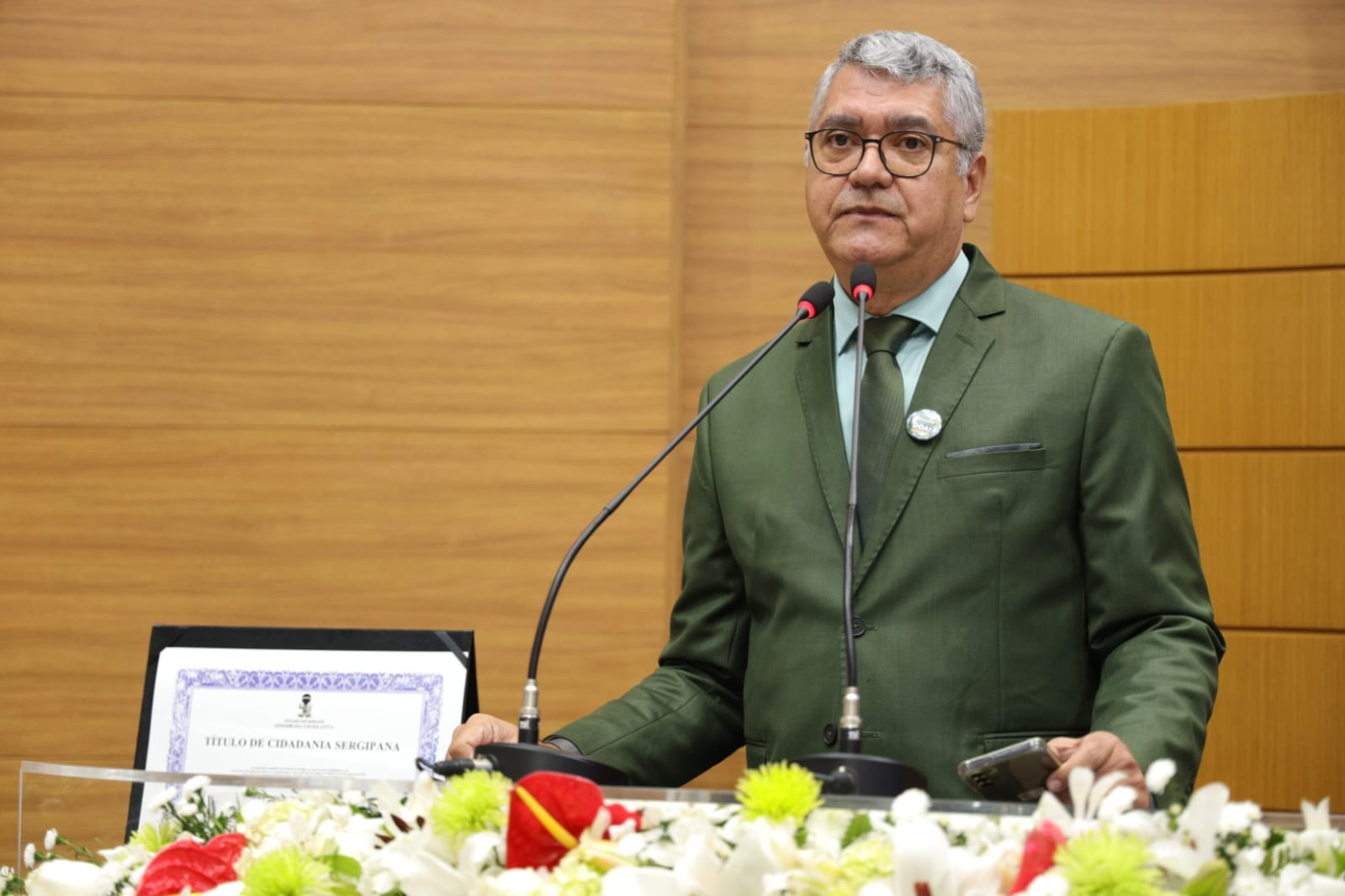Além do deputado Georgeo e do homenageado, compuseram a mesa de honra a Sra. Marcela Rocha, diretora operacional da Secretaria Municipal de Saúde de Aracaju, que representou a prefeita de Aracaju, Emília Corrêa e o presidente da Associação de Renais Crônicos e Transplantados do Estado de Sergipe (Arcrese), Sr. Elves Cavalcante.