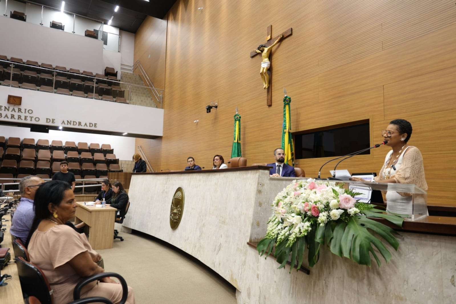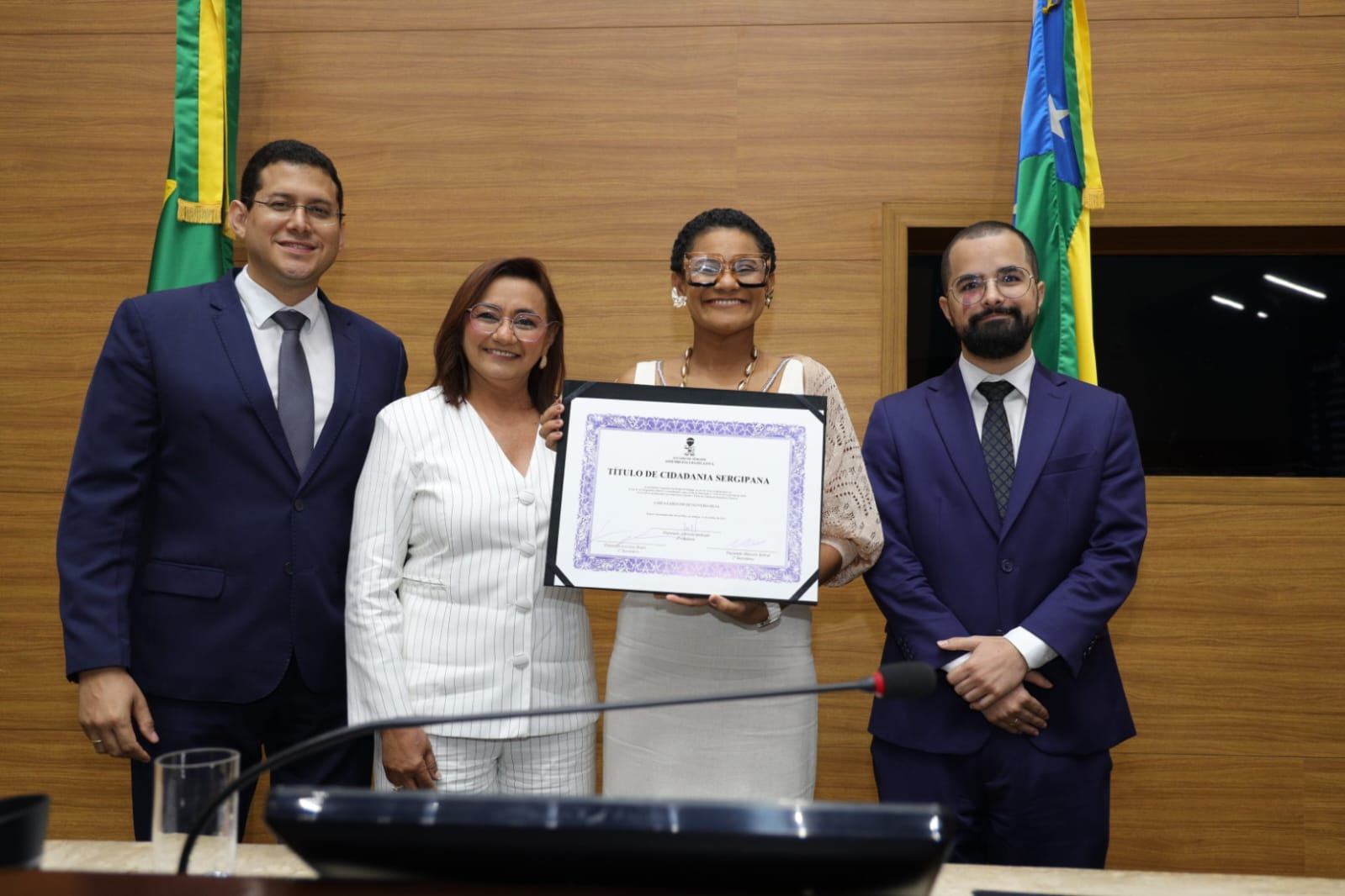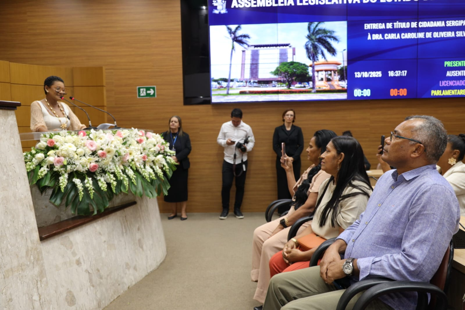 Na tarde desta segunda-feira (13), o Plenário da Assembleia Legislativa de Sergipe (Alese) foi cenário de uma emocionante solenidade que marcou a entrega do Título de Cidadania Sergipana à defensora pública Carla Caroline de Oliveira Silva. A homenagem, proposta pela deputada estadual Carminha Paiva (Republicanos), reconhece a expressiva contribuição da homenageada para o fortalecimento da justiça social, da cidadania e dos direitos humanos em Sergipe.