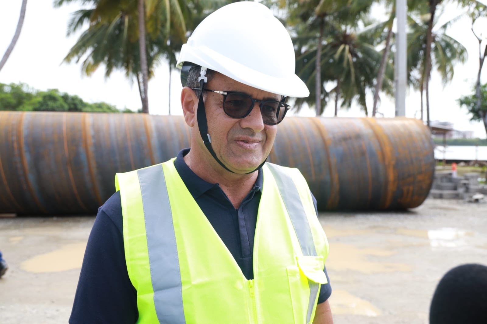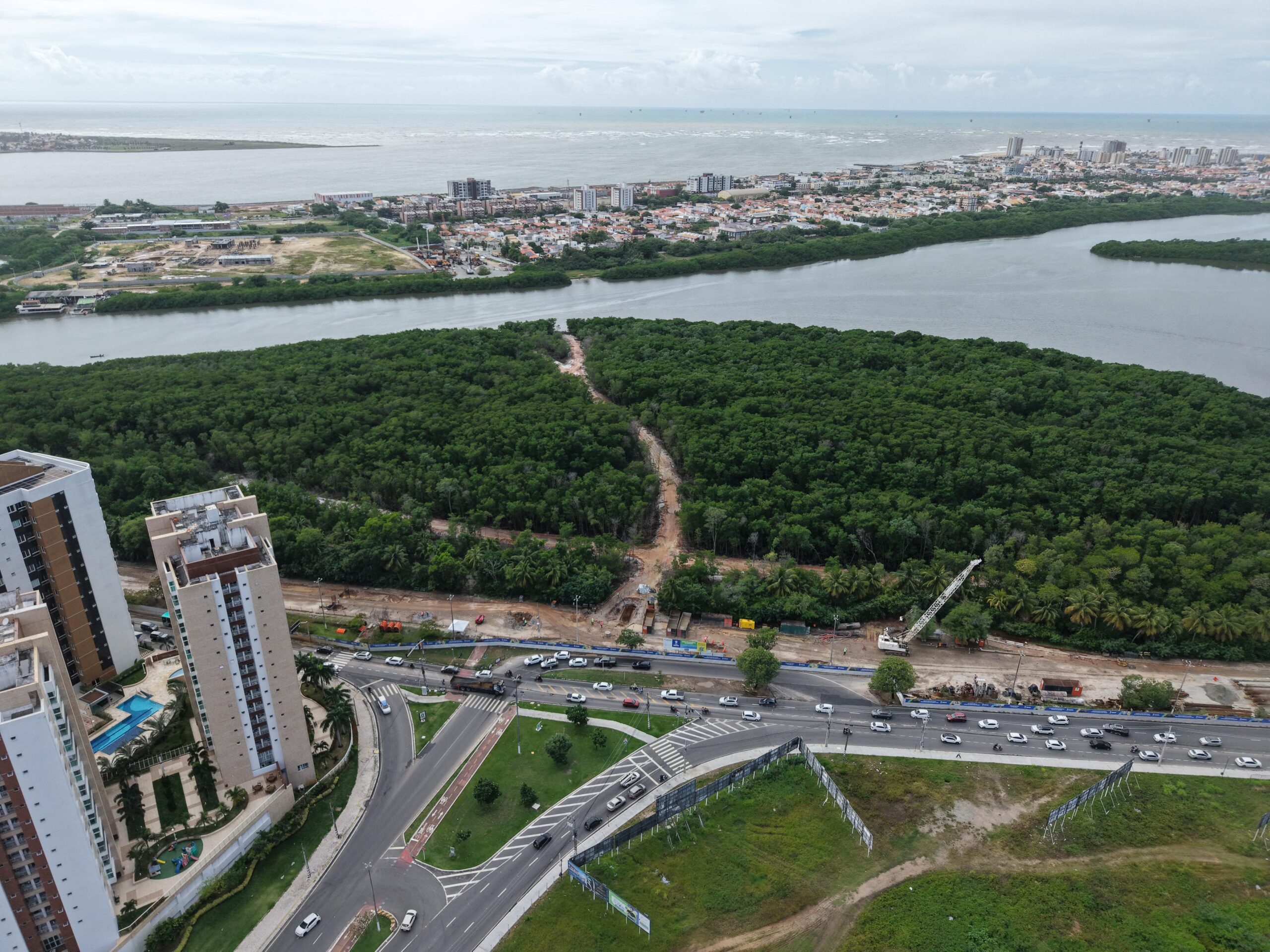 O empreendimento está na fase de instalação das estacas de sustentação, tanto no lado da Avenida Beira Mar quanto no lado do bairro Coroa do Meio.