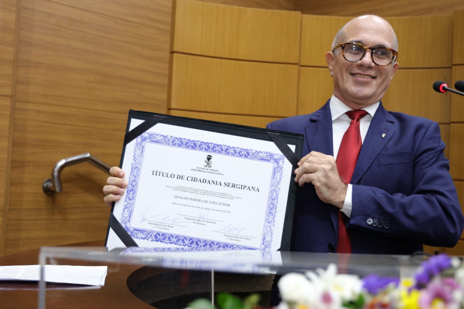 “Estou em Sergipe há 20 anos e acredito que essa homenagem me faz acreditar que eu tenha contribuído bastante para o desenvolvimento da nossa área de farmácia e fico muito grato pela oportunidade desse reconhecimento por parte do deputado Georgeo e da Assembleia Legislativa de Sergipe e agradeço a Deus por estar recebendo essa honraria tão importante”, afirma Divaldo Pereira Júnior.