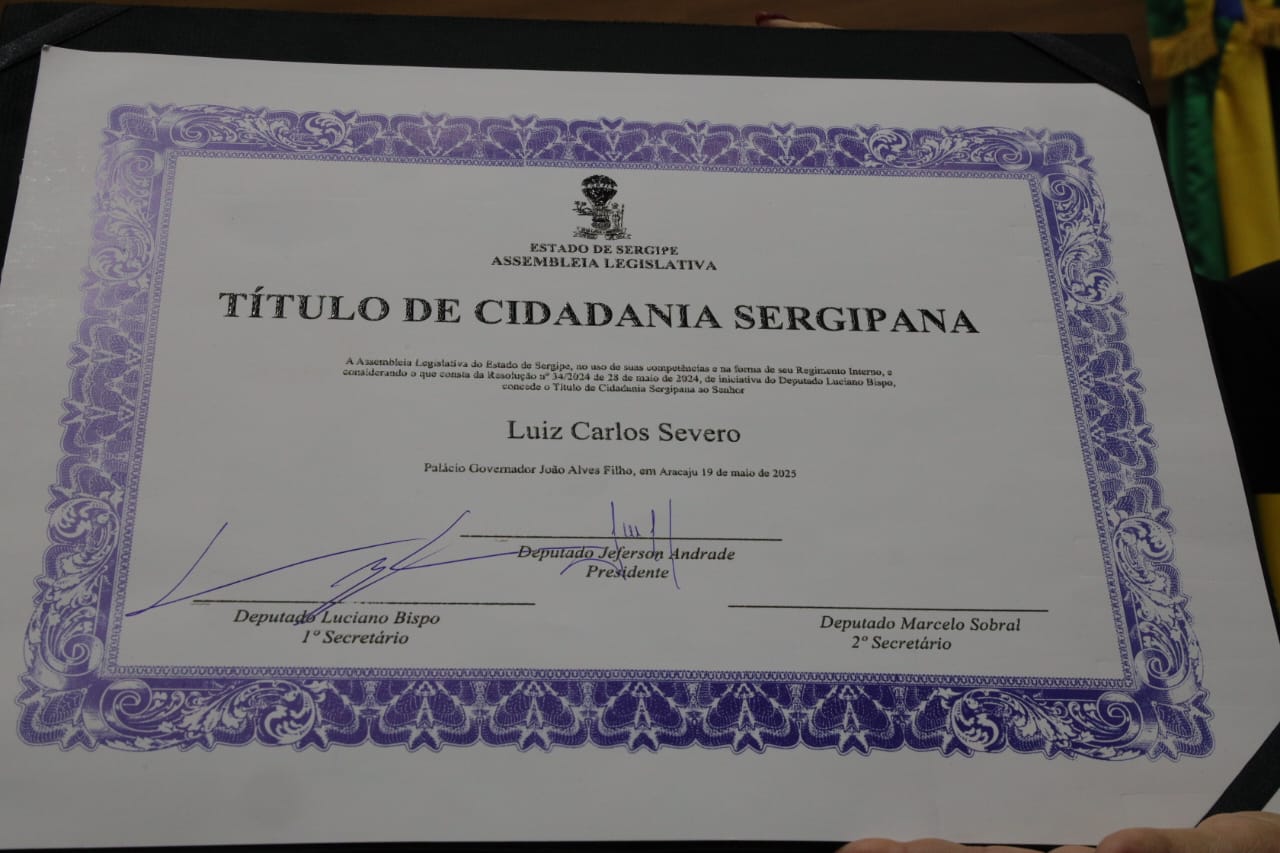 Os deputados e deputadas estaduais da Assembleia Legislativa do Estado de Sergipe (Alese) realizaram nesta segunda-feira (19), em Sessão Especial, a entrega do Título de Cidadania Sergipana ao empresário Luiz Carlos Severo. A propositura é do  Luciano Bispo (PSD) e tiveram o objetivo de homenagea-lo pelos  serviços prestados ao estado.