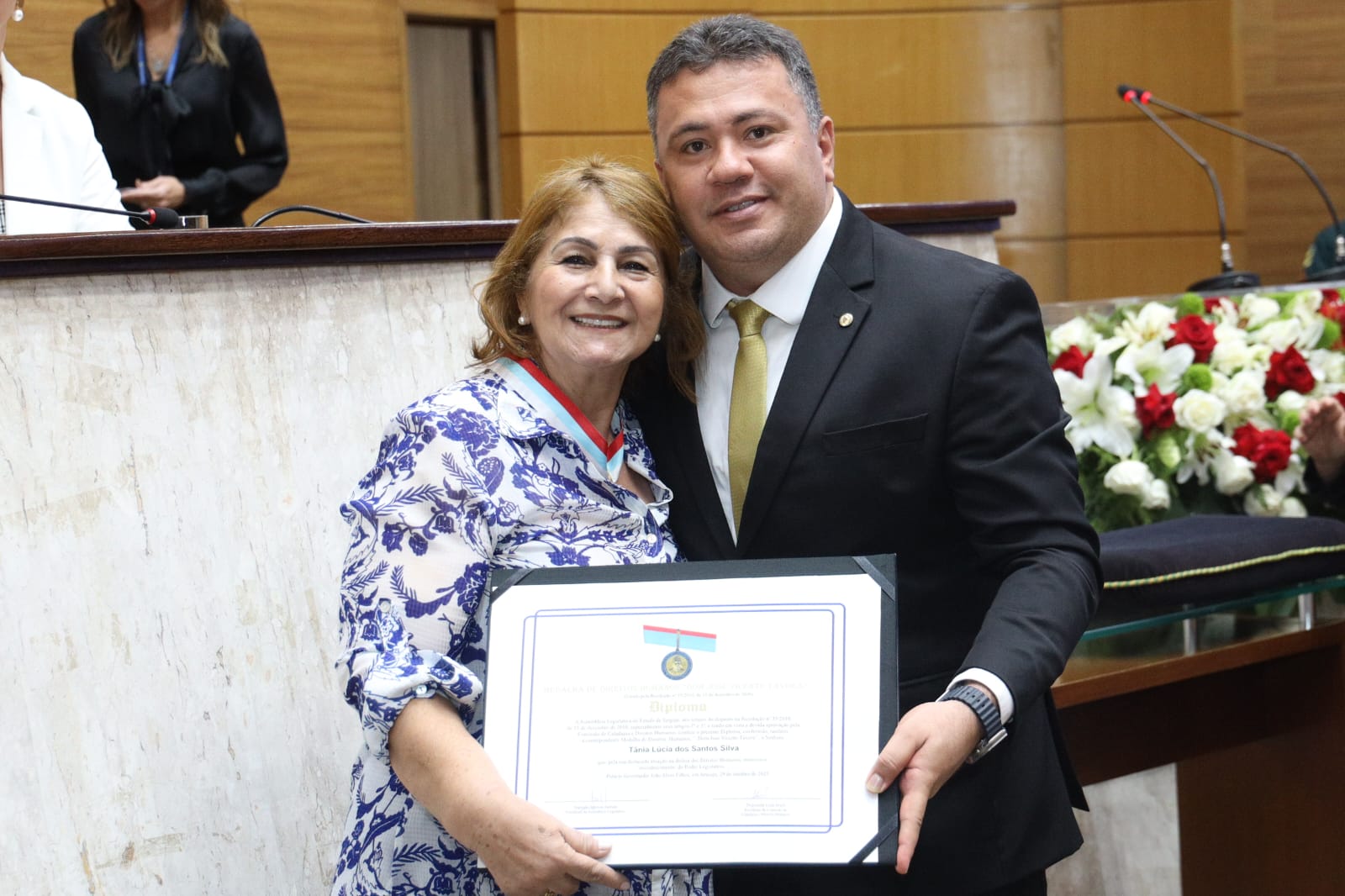 • Érica Lima Cavalcante Mitidieri, Secretária de Estado da Assistência Social, Inclusão e Cidadania (Seasic), e primeira-dama do Estado, foi indicada pela deputada Dra. Lidiane Lucena (Republicanos). Ela expressou sua alegria ao receber a homenagem e destacou a importância do trabalho realizado. “É uma grande alegria receber essa homenagem, pois ela demonstra que o trabalho que estamos realizando realmente está chegando às pessoas. É o reconhecimento de uma gestão e, especialmente, do trabalho da Secretaria, onde temos buscado fazer sempre o melhor, promovendo valorização, escuta, dignidade e impacto real na vida das pessoas”.