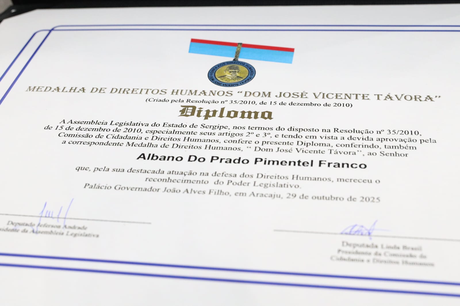 Nesta quarta-feira (29), a Assembleia Legislativa do Estado de Sergipe (Alese) concedeu a Medalha de Direitos Humanos “Dom José Vicente Távora” a diversas personalidades sergipanas, em reconhecimento aos relevantes serviços prestados à promoção e à defesa dos direitos humanos no Estado.