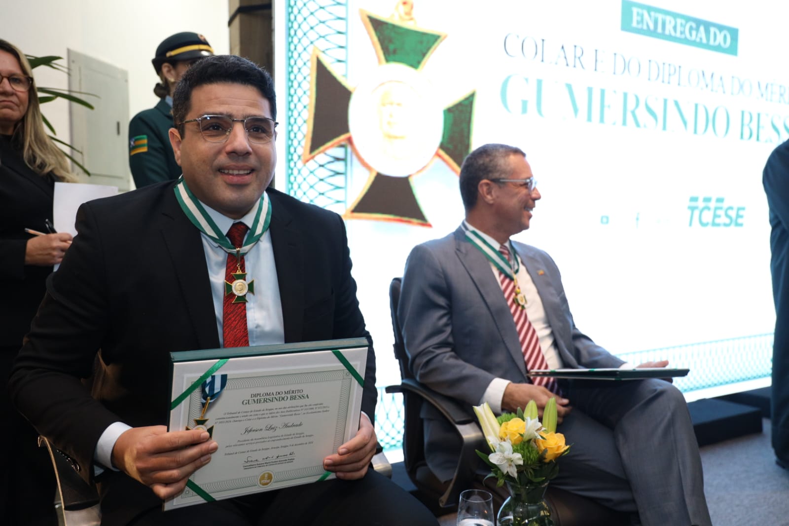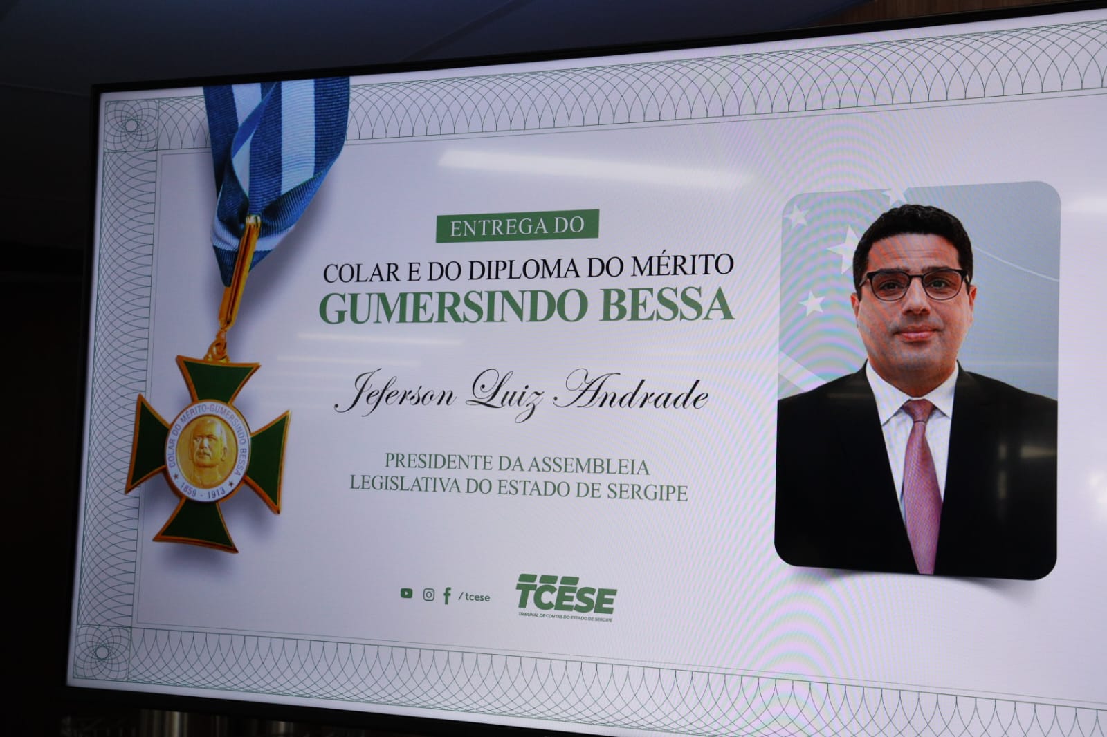 O presidente da Assembleia Legislativa de Sergipe (Alese), deputado Jeferson Andrade (PSD), recebeu na manhã desta segunda-feira, 9, a mais alta honraria do Tribunal de Contas do Estado (TCE/SE): a outorga do colar e do diploma do Mérito Gumersindo Bessa.