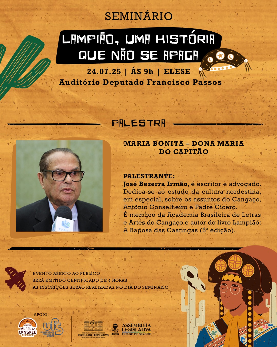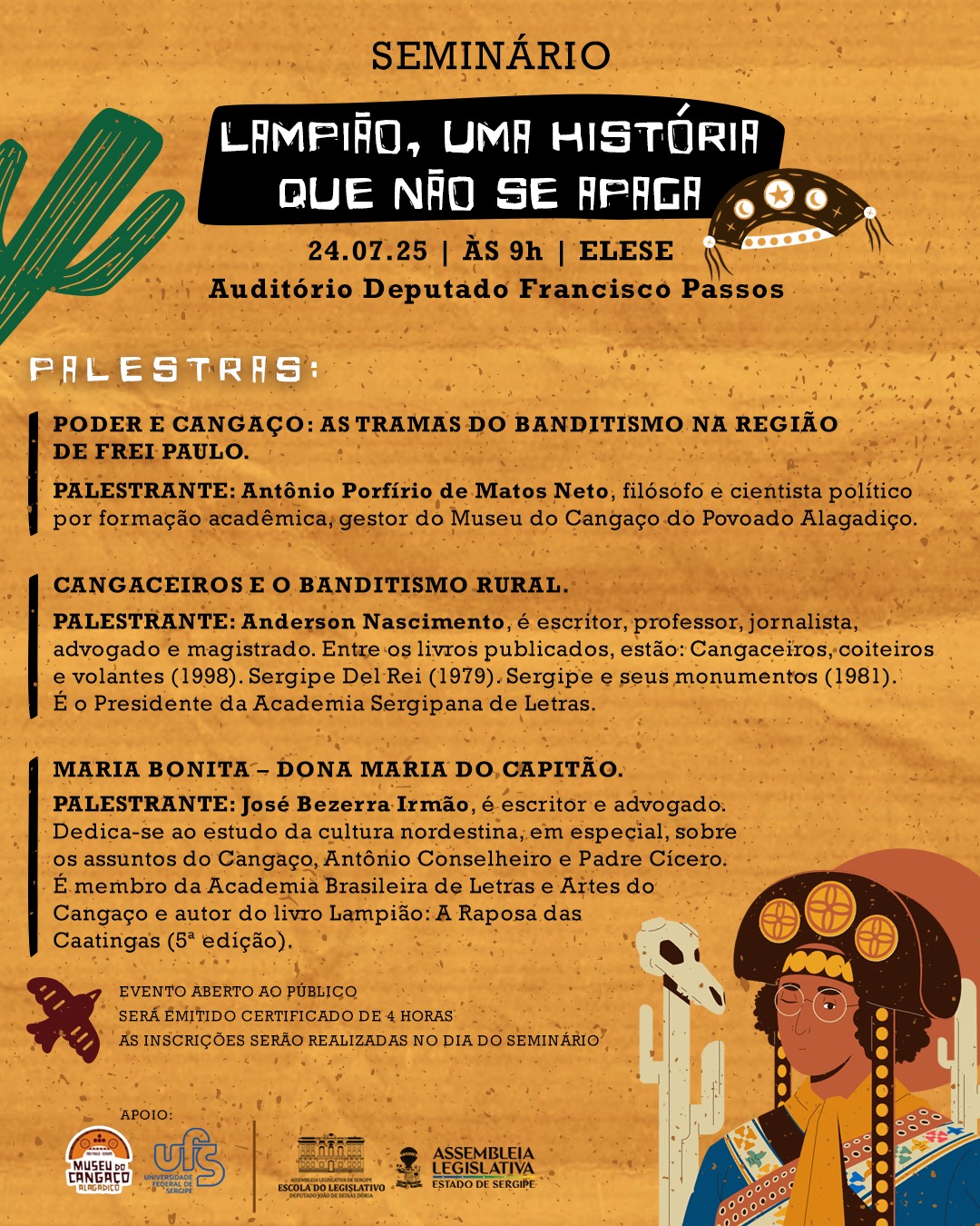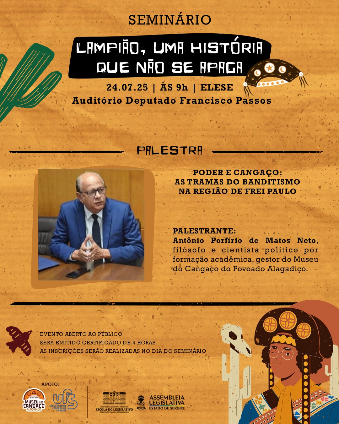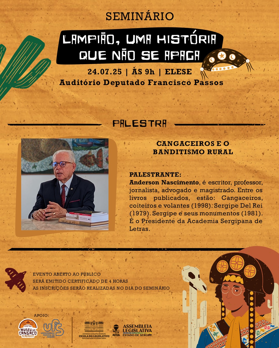 A Assembleia Legislativa do Estado de Sergipe (Alese) por meio da Escola do Legislativo (Elese), promove nesta quinta-feira (24) o Seminário “Lampião, uma história que não se apaga”, com a participação de três importantes estudiosos sobre o tema: José Anderson do Nascimento, Antônio Porfirio de Matos Neto e José Bezerra Irmão, todos eles pesquisadores e escritores sobre a história do Rei do Cangaço. A história de Lampião e do cangaço ainda desperta curiosidade e gera debates sobre a figura do cangaceiro.