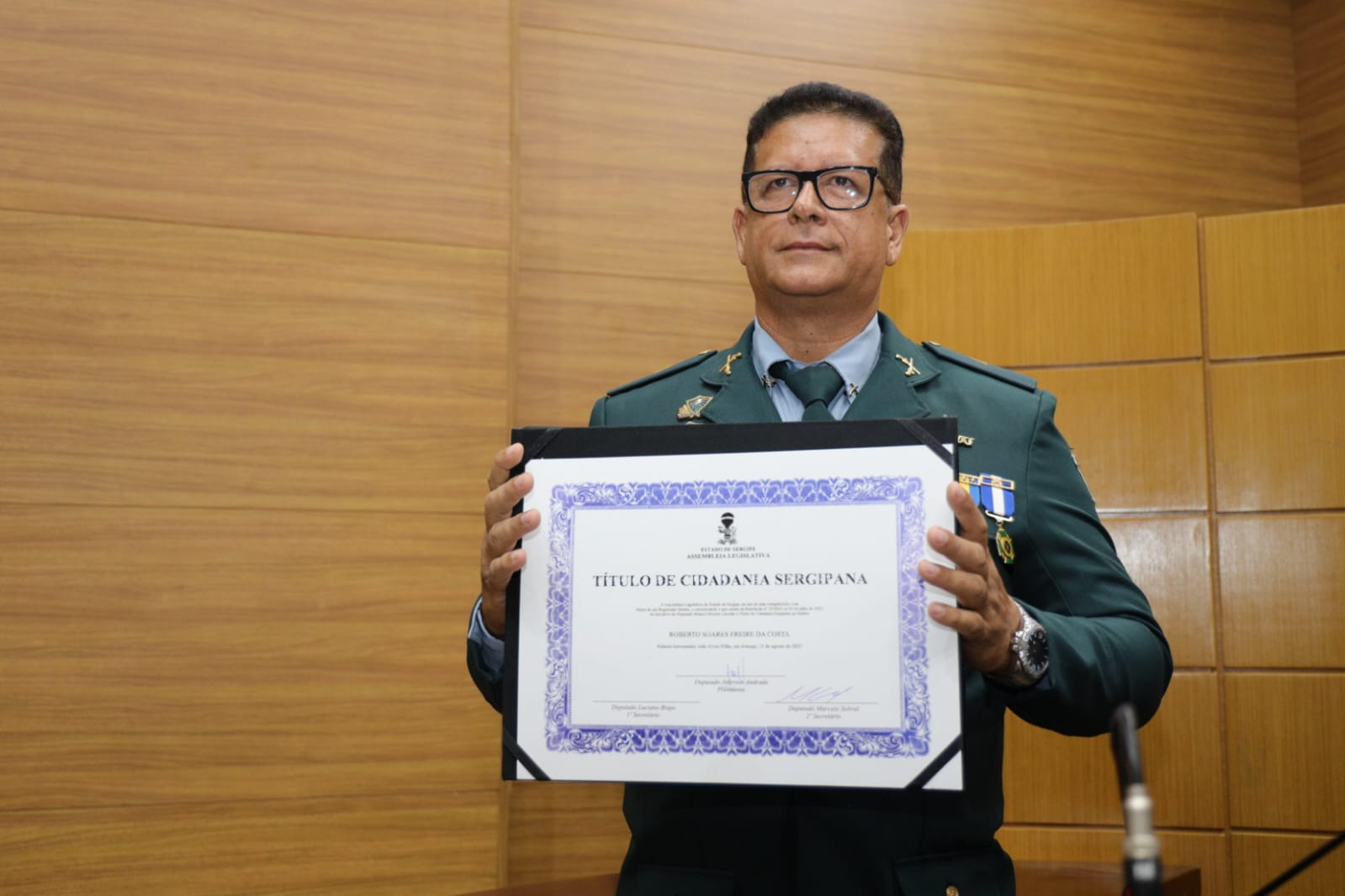 “É com grande honra e profundo respeito que entregamos hoje o Título de Cidadão Sergipano ao subtenente Roberto Freire. Sou um apaixonado pela Polícia Militar de Sergipe, até porque meu pai foi policial, era soldado da corporação. Tenho um respeito enorme por essa farda e pelo que ela representa. Ao ver um oficial tão dedicado, que adotou nosso estado como sua casa, achei justo oficializar esse reconhecimento. É um orgulho para todos nós tê-lo em nossa corporação, servindo com tanto comprometimento à Polícia Militar de Sergipe.”