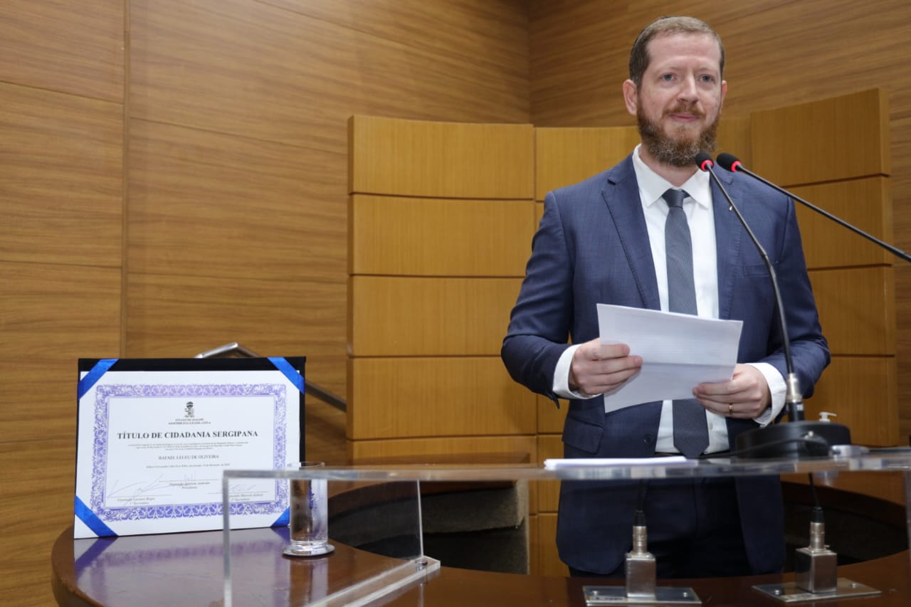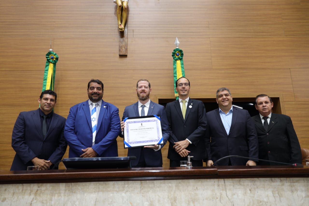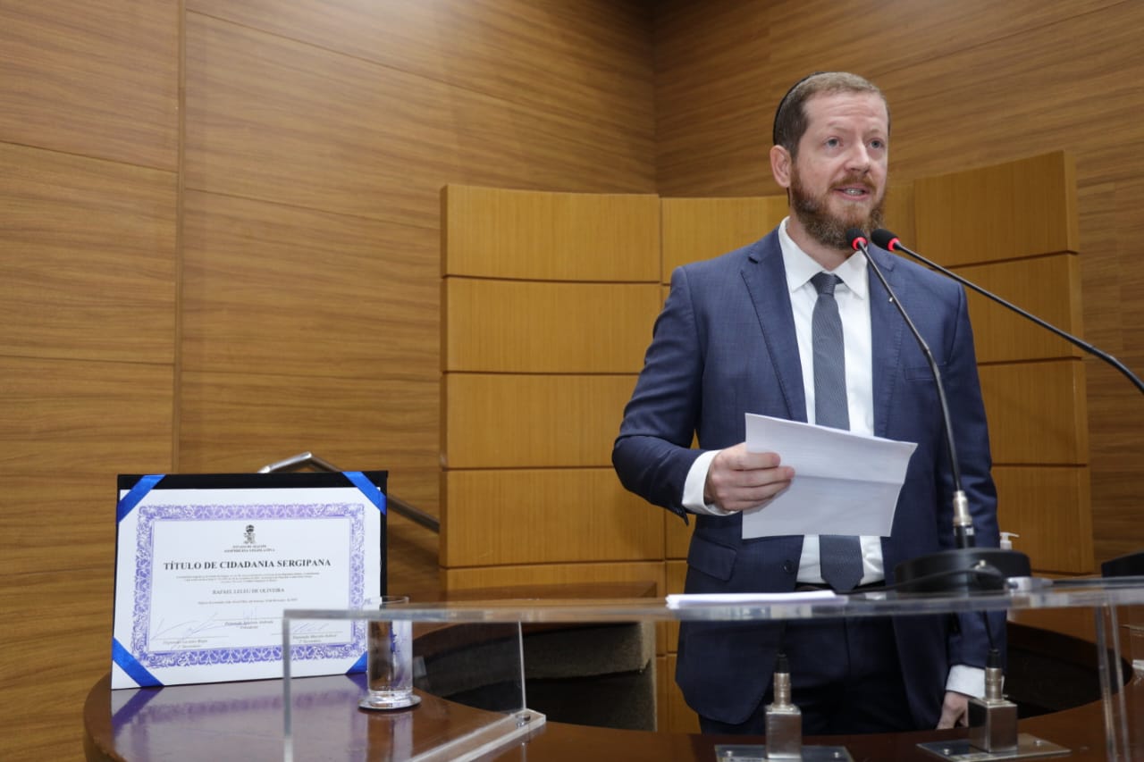 O deputado Luizão Donatrampi (União Brasil) entregou na manhã desta sexta-feira (14), no plenário da Assembleia Legislativa de Sergipe (Alese), o Título de Cidadão Sergipano ao advogado e vice-presidente da Sociedade Israelita de Sergipe, Rafael Leleu de Oliveira. Pernambucano de Recife, ele escolheu morar em Sergipe desde 2018, visando dar uma melhor qualidade de vida às filhas, iniciando atividades no ramo hoteleiro e fundando a Sociedade Israelita em 2021.